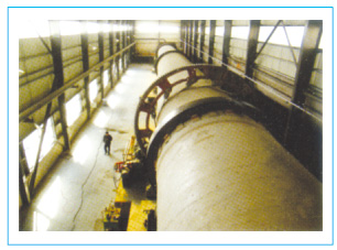 內熱式回轉窯由筒體、支承裝置、傳動裝置、窯頭尾罩及密封裝置、內襯、燃燒系統、控制系統等部分組成。 回轉窯的窯體與水平呈一定的傾斜角度, 整個窯體由托輪裝置支承, 并有控制窯體上下竄動的檔輪裝置, 傳動系統包括主傳動以及輔助傳動兩套裝置,窯頭、窯尾密封裝置采用了組合密封方式, 保證了密封的可靠性。